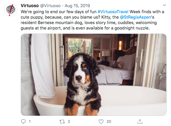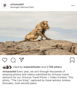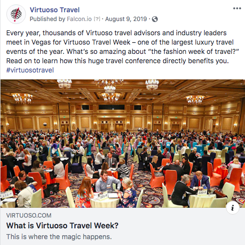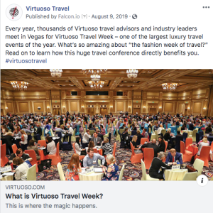I owned the social media strategy for Virtuoso Travel Week, one of the world’s largest luxury travel conferences. The weeklong event attracted more than 6,000 travel industry professionals. Our goal was to engage the network’s B2B attendees without alienating the brand’s B2C following, and we succeeded by sharing compelling, aspirational, and consumer-friendly travel news that stemmed from the conference.
